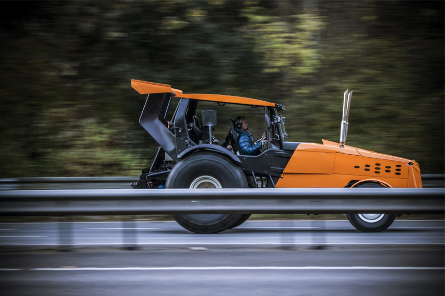 While a normal tractor only has brakes on the rear wheels, the Track-Tor has them on all four, while a split hydraulic handbrake allows each rear wheel to be braked independently, which is ideal for off-road tomfoolery. LED lights from an Ariel Atom and bright orange Lamborghini-inspired paintwork are complemented by Matt’s wacky extras, including a rotating boot-cleaning brush, barometer and rack to accommodate wellies and spades.