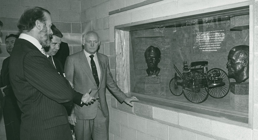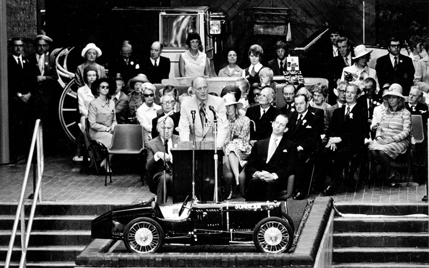 This ambitious project, which Montagu’s advisors had warned against, came to fruition on 4 July 1972 when The Duke of Kent came to Beaulieu to open what was to become Britain’s National Motor Museum. The newly designed visitor complex separated the new motor museum buildings from the historic abbey ruins and Palace House. It also relocated the car parks, diverting the bulk of visitor traffic away from Beaulieu village. The new buildings, which included a purpose-built admissions centre, cafeteria, motoring research library and offices, won several awards. The most significant of these, the prestigious National Heritage Museum of the Year, was awarded in 1974. In the same year, a monorail was installed, passing through the museum at high level.