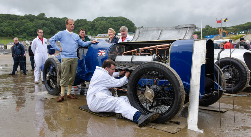 Supporting the run was the 1933 aero-engined Napier Railton Special, which holds the all-time lap record of 143.44mph at Brooklands. The Napier-Railton has its own unique history at Pendine, having been the star (alongside James Mason and Ava Gardner) of the 1951 movie Pandora & The Flying Dutchman. In the film, the car is used for an attempt on the Land Speed Record, for which the action sequences (culminating in the car being driven into the sea to quench an engine fire) were filmed on Pendine Sands during 1950. In recent months, a film researcher has established that amongst the ‘extras’ in the crowd scenes for these sequences was the famed Welsh poet, Dylan Thomas. Owned by the Brooklands Museum since 1977, the Napier-Railton also made a few runs along the sand at Pendine, with Museum Director & CEO, Allan Winn, in the driving seat.