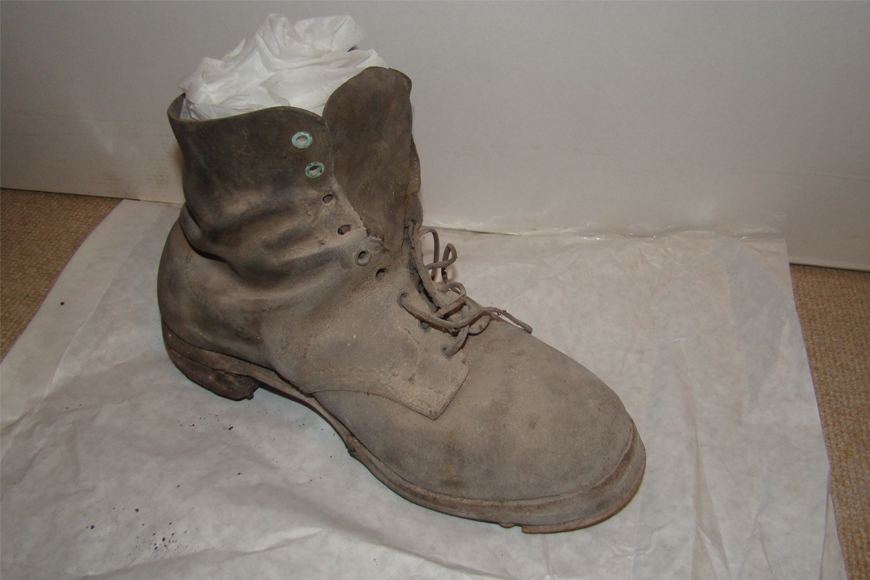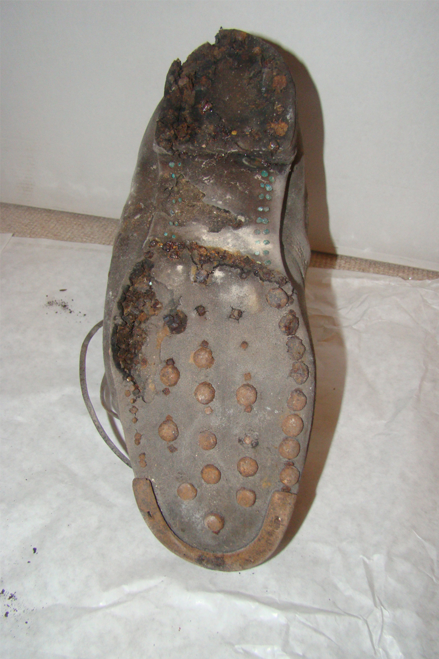 “Concealed items were purposely left under the floorboards, behind fireplaces, under windows and in chimneys to ward off evil spirits, or to bring good luck and fertility to the occupants. This particular boot was discovered under the original entrance to the building, which would suggest this was placed to prevent evil crossing the threshold. It is a hobnail boot and has been well-worn, though debate is still on-going as to whether it is a male’s or female’s boot.”