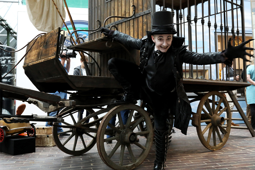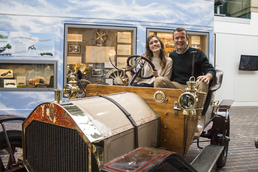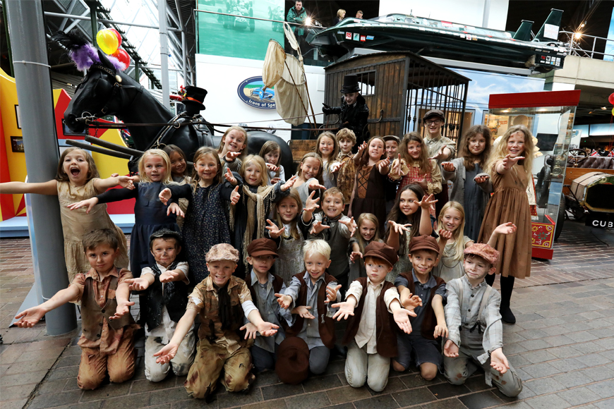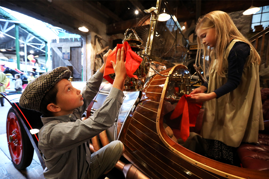 At Beaulieu’s preview launch of Chitty Chitty Bang Bang 50 years, Lord Montagu and celebrity guest Adrian Hall (who played Jeremy in the film) recreated a scene from the film as they emerged out of the garage in Chitty in the National Motor Museum – while a cast of 30 children from a stage production sang Chitty Chitty Bang Bang. *