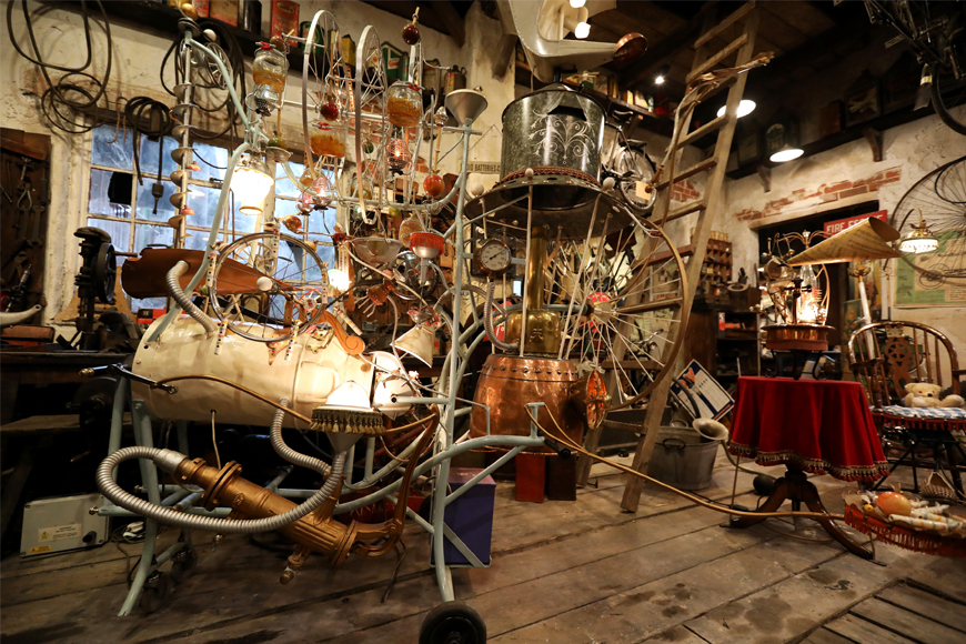 Discover the film’s amazingly inventive machines of Rowland Emett as they whir into life in the recreated Coggin’s Garage – including the Humbug Major Sweet Machine, Clockwork Lullabye, Little Dragon Carpet Sweeper and Hot Air Rocking Chair.