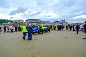 Crowds of visitors and motoring enthusiasts surrounded the car on the beach as the historic event was celebrated with a roaring engine start-up followed a thrilling, evocative drive along part of the expansive beach. Threatening rain clouds evaded; the streamlined vehicle looked magnificent along the Carmarthenshire coastline.