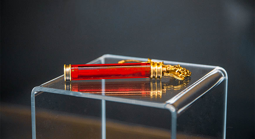 Safin’s toxin vial, used by actor Rami Malek on the island set at Pinewood Studios, also joins the exhibition. When the vial breaks in the movie, Bond is permanently infected with the potentially lethal toxin.