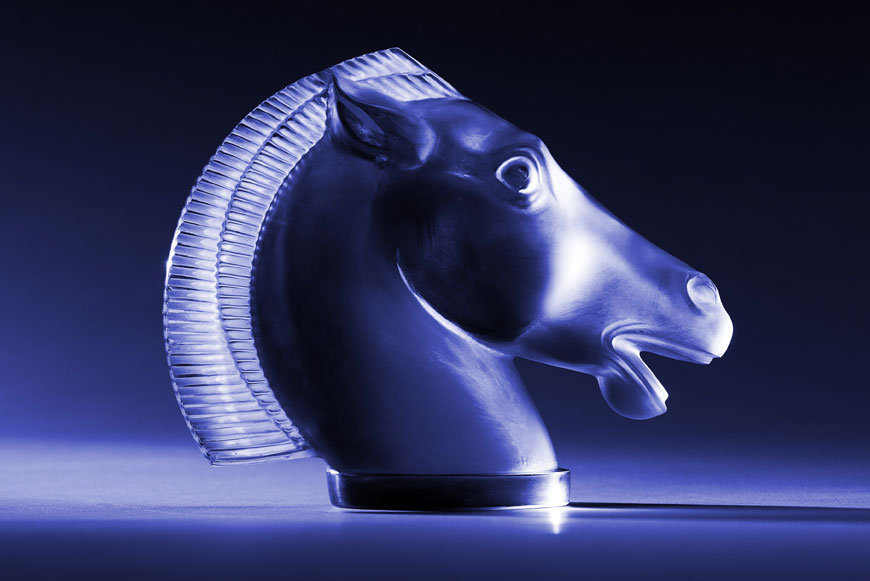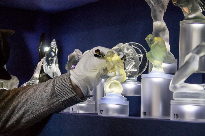 As a keen fisherman, the private owner began his extraordinary Lalique collection with the glass perch, which started a six-year quest to find true and perfect mascot examples. From the light-radiating, delicate veined wings of a dragonfly to the heartiest falcon mascot with its thick, tapered neck which fits tightly into the mount, the collection includes majestic animals and human forms that bring art into everyday life.