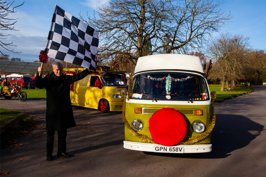 Scores of brightly coloured VW campers and cars will start their journey as Lord Montagu waves the chequered flag to start the New Forest VW Santa Run in the grounds of the National Motor Museum.