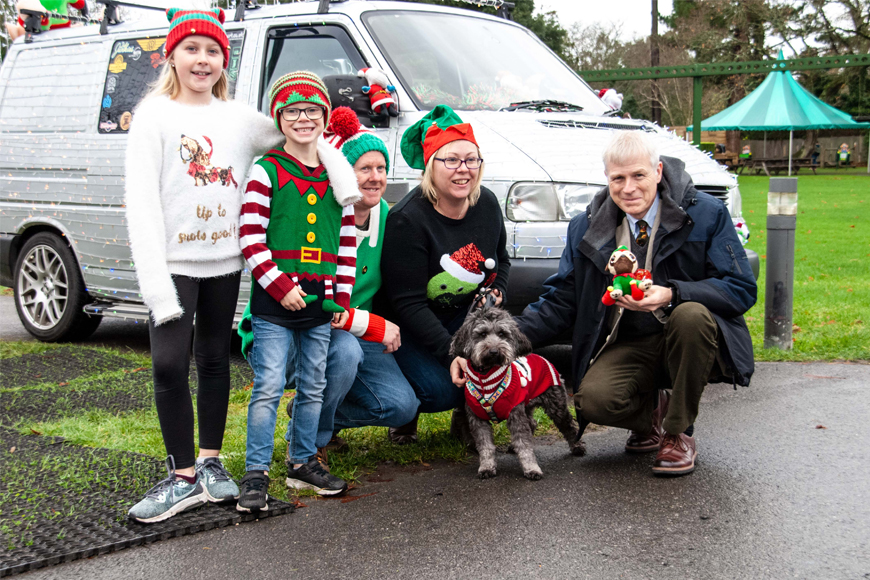 At the start-line in the grounds of the National Motor Museum, Lord Montagu gave prizes for the best dressed van and family. The coveted Best Dressed Family prize was won by a collaboration of two families. Austen, Nicky, Aoife, Fintan and Orlagh of the Hornsby family from Yateley near Farnborough, joined forces with David, Christy, Lucy and Ollie of the Court family from Farnborough, to create a team of eight Santas and one Rudolf!