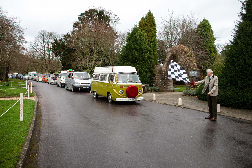 Lord Montagu waved the chequered starting flag for the biggest ever VW Santa Run, as a record 152 VWs set off in convoy from Beaulieu to deliver Christmas presents to youngsters at the Piam Brown unit at Southampton General Hospital.