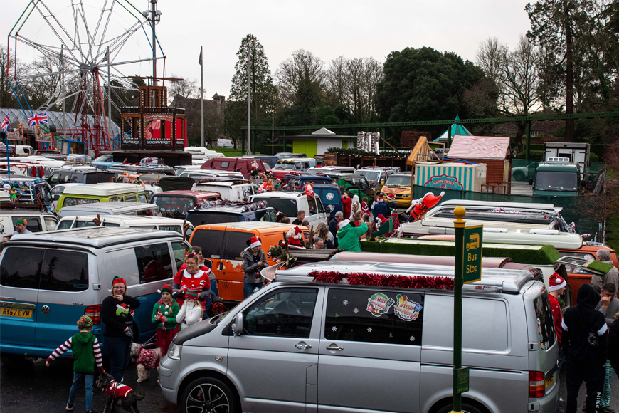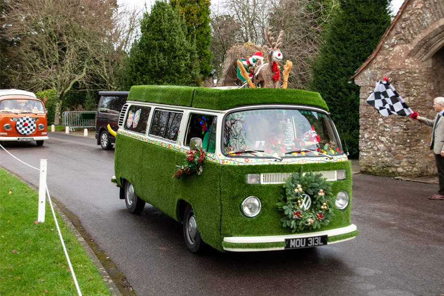 As many as 385 participants entered into the Christmas spirit for the annual charity run across the New Forest on Sunday 2nd December, by dressing up in festive costumes and covering their VWs with wacky seasonal decorations. Classic split-screen and bay-window VW T2 campers were joined by their modern T3, T4, T5 and T6 van and motorhome counterparts to fill the Beaulieu Events Arena, along with Beetles and even trikes with VW engines.