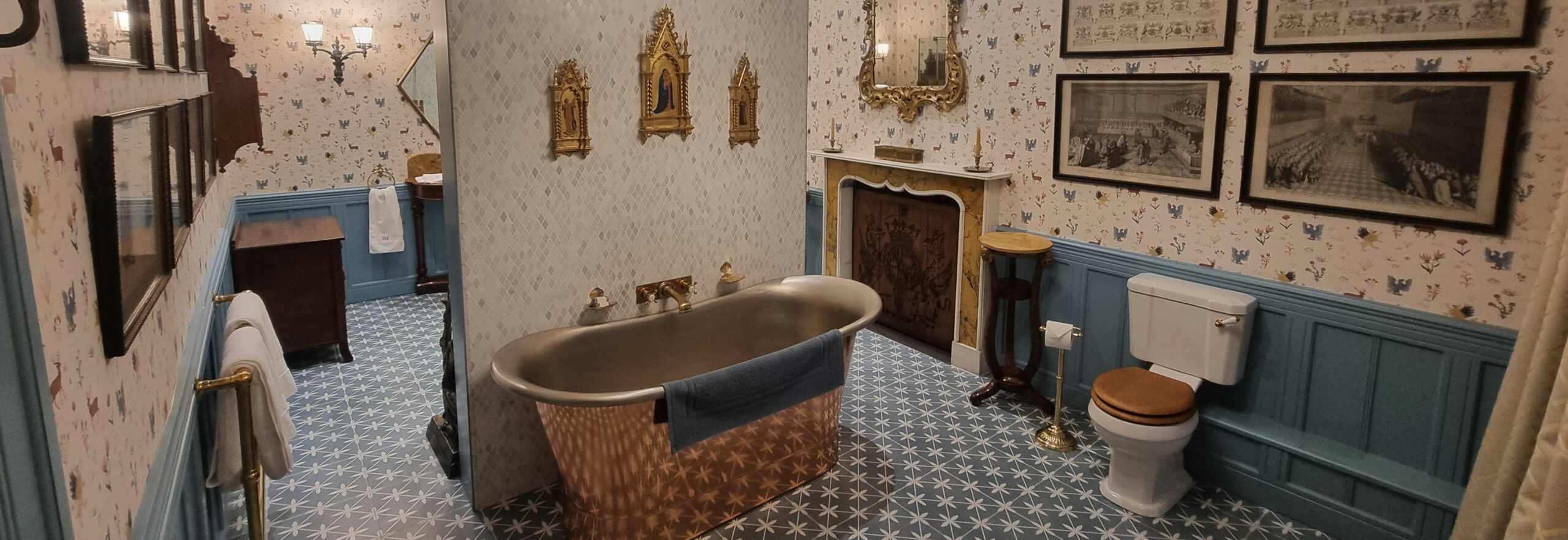 As the en-suite bathroom to the Heraldry Bedroom, the designers didn’t have any difficulty persuading me to continue the heraldic theme but in a more playful way. All the elements are taken from the Montagu coat of arms which was originally granted to my great-grandfather Henry, 1st Baron Montagu of Beaulieu. The eagles come from my Monthermer ancestors, stags from the Scott branch of my family and rampant griffins which are the supporters of the shield. (There is also a pair guarding each side of the shower cubicle!) These mythical animals have the body, tail and back legs of a lion and the head and wings of an eagle.