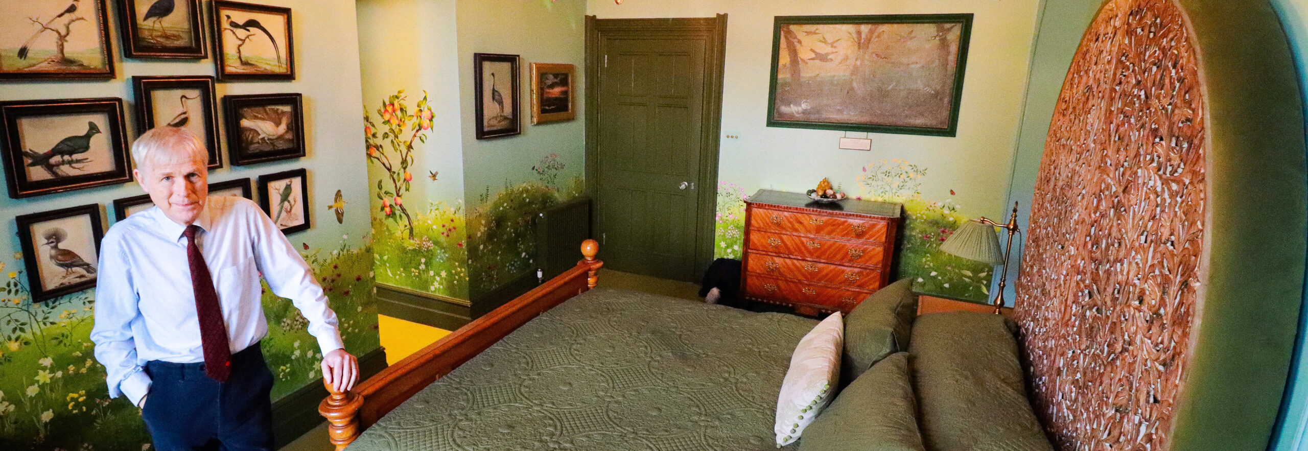 BBC South presenter Sam Fraser was one of the first guests to use the room. From the bed, I hope she looked up to see how the sky, populated by many birds, continues from the walls to the ceiling where a faux opening to an imaginary sky frames a stylised golden sun shining from its centre. Just the thing for a star of stage and screen!