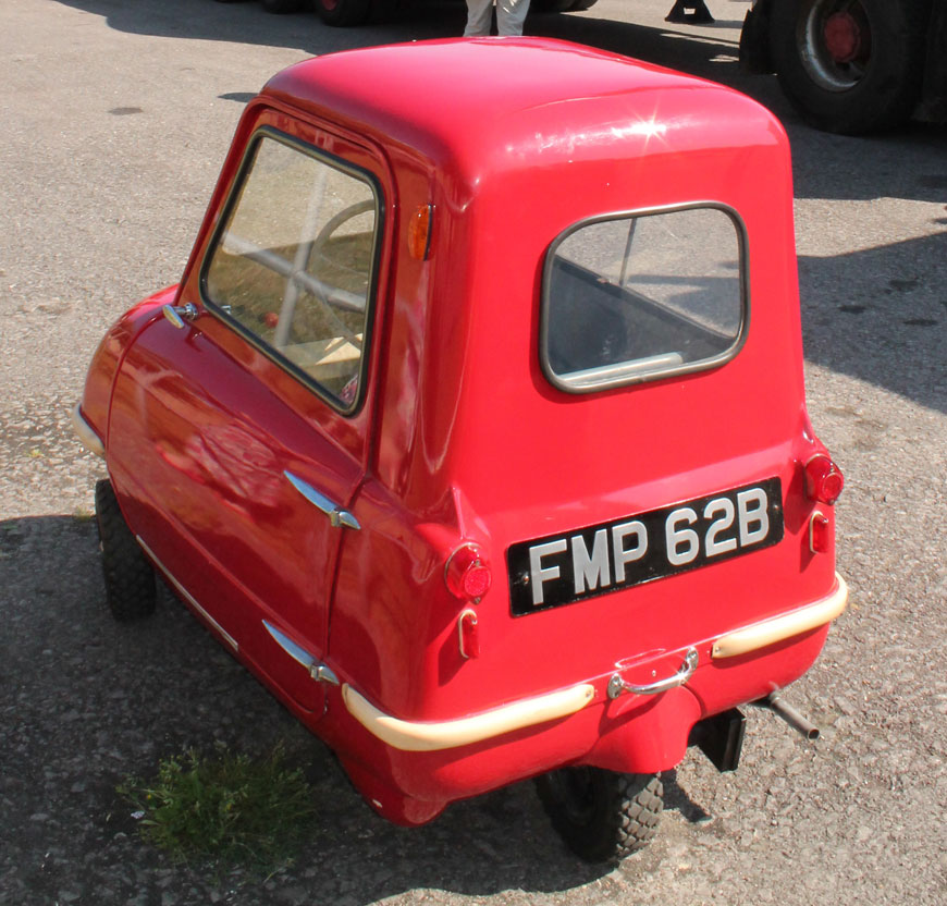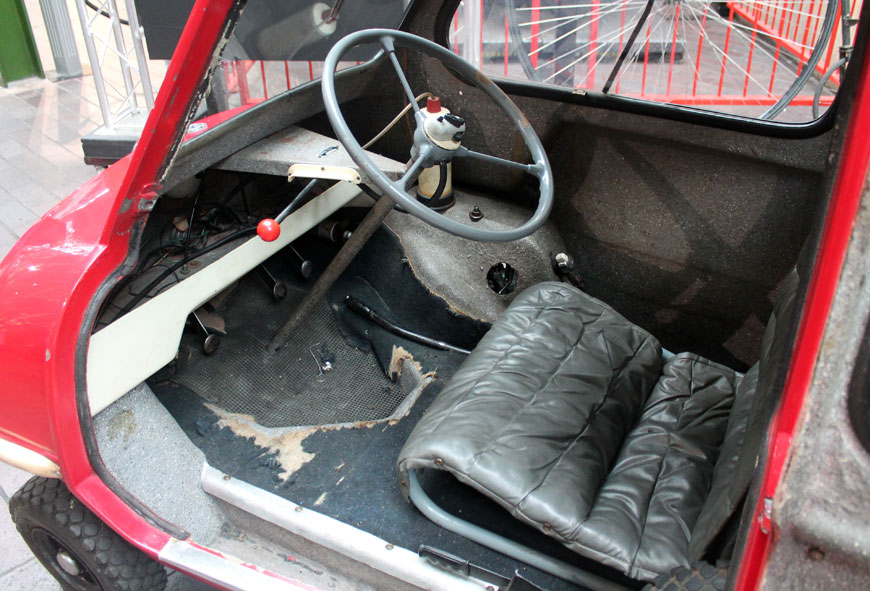 There is only one door and a single headlamp, while three tiny wheels hold the car off the ground. What looks like a long handbrake lever is in fact used for starting the 49cc two-stroke Sachs engine, which is located next to the driver’s right leg. This engine produces 4.2hp, which is sufficient to propel the P50 up to a dizzying 40mph. There may not be a reverse gear, but with a carrying handle mounted on the back, this lightweight car can simply be picked up and manoeuvred by hand.