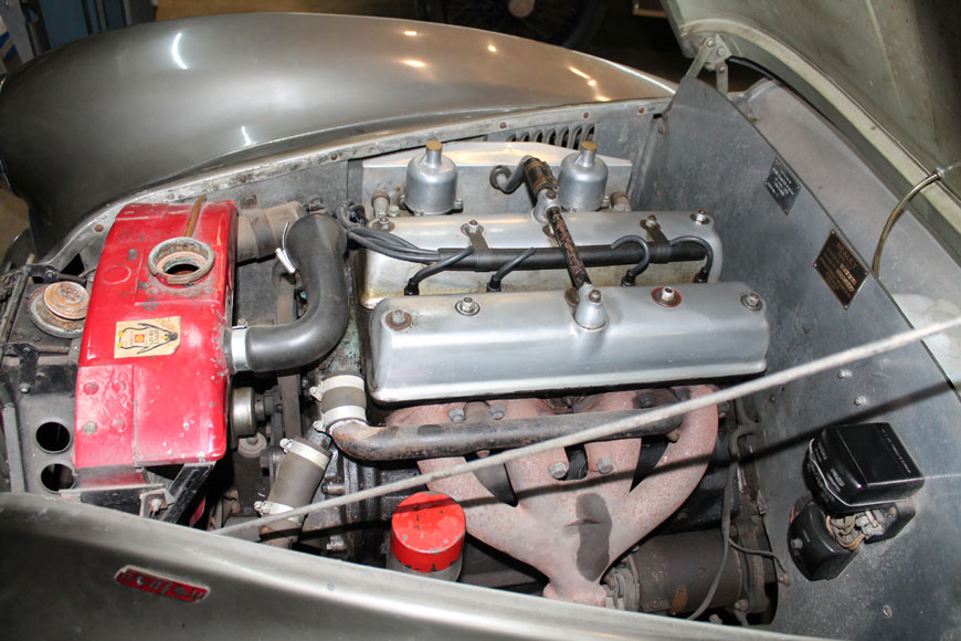 Interestingly, the Healey’s four-cylinder engine may appear to the casual observer like it has twin overhead camshafts, but as with contemporary Riley engines, the valves are opened by two rocker shafts at the top of the engine, which are operated by camshafts located much lower in the engine block.