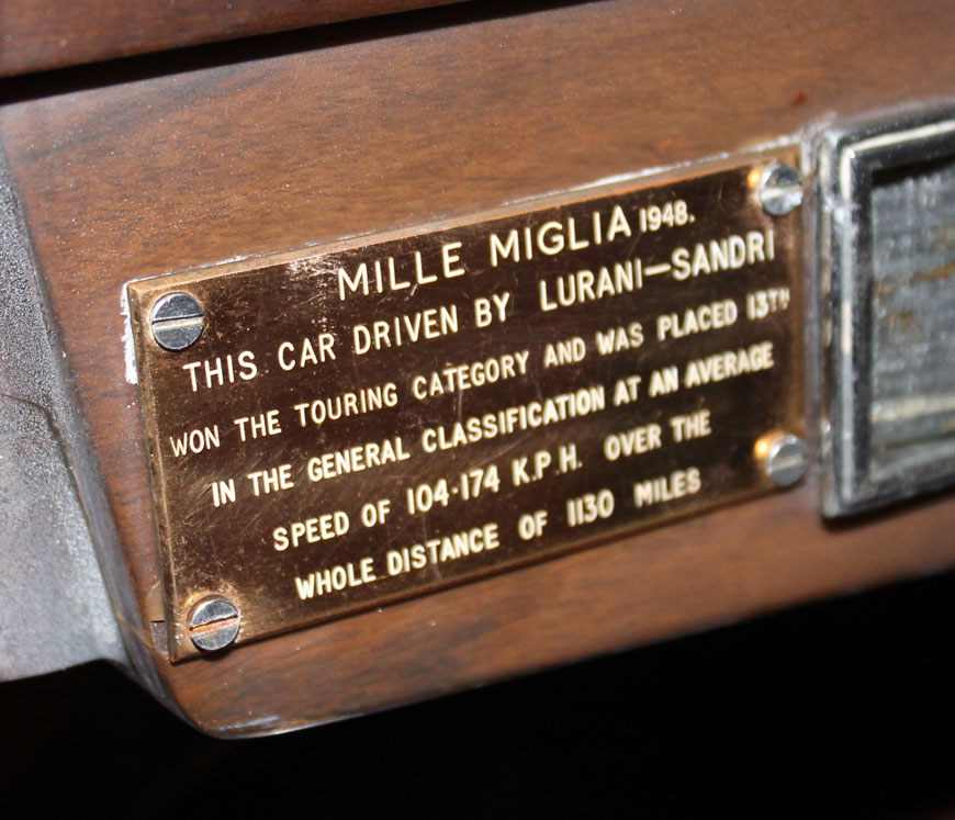 This 1947 example has quite a tale to tell. Driven by Lurani/Sandri in the 1948 Mille Miglia, the car won the touring category and was placed 13th overall in the legendary long-distance race. A plaque on the Healey’s dashboard declares that it achieved an average speed of 104mph over 1,130 miles.