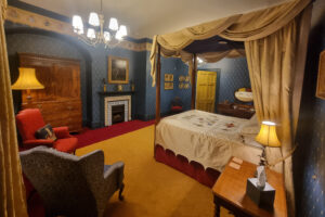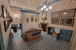 Before reaching the largest of the bedrooms, visitors will find the Throne Room. Its ‘throne’ lavatory was made by antique restorer Alex Webster from TV’s The Woodland Workshop which was filmed on the Beaulieu Estate. Assembled mainly from pieces of old furniture, the back is emblazoned with a specially carved Montagu coat of arms, over which there is an ornate gothic canopy which hides the cistern.