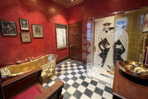 The room has a large gold coloured bath tub and the tiles in the shower cubicle continue the royal theme with an illustration of a medieval King and Queen by Belinda, Lady Montagu.