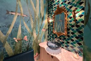 The adjacent bathroom adopts the Water Babies as its theme, inspired by the classic children’s novel by Charles Kingsley. The fantasy tale has been re-imaged by Emma Martin as an underwater room in which fish, turtles and water babies are swimming around you.