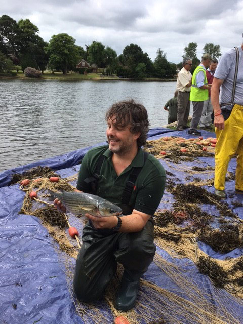 By this time a larger crowed had gathered, including members of the Montagu family and the new Dean of Winchester. The second haul began and we were all amused to see many of the fish jumping up out of the water and clearing the net, escaping back to the river. The grand total at the end of the haul was two grey mullet, which Steve (pictured) kindly showed to the children so they could get a close up look at the species. Then they were placed into a crate and taken to Place House to be prepared and cooked for the Montagu family’s lunch. If you would like to join this free tour the final date for the season is Friday 7th July 2017.