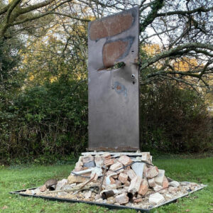 Some of this year’s sculptors are new to Sculpture at Beaulieu and others return with new pieces to show. A highlight of this year’s show is Robert Marshall’s ‘Collateral Damage’. The evocative piece is a front door which he salvaged from a house bombed during the conflict in Ukraine. The scorch marks can still be clearly seen on the upper section, and the bomb blast has mangled the locks. The door has been mounted on a pile of rubble and is said to represent the safety people have at home.*