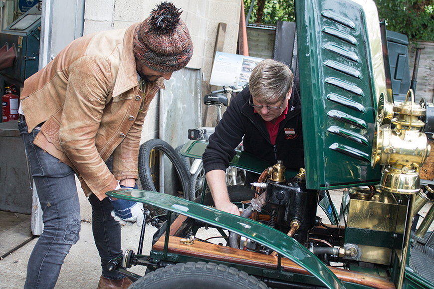 In preparation for his gruelling drive in the 115 year-old De Dion Bouton Model Q, Fuzz was put through his paces in a driving lesson at Beaulieu this week. Mastering the car’s controls and discovering some of its foibles, under the expert guidance of National Motor Museum Senior Engineer Ian Stanfield, he took to the open road for a 10-mile run practice run across the New Forest. With a top speed of less than 30mph, Fuzz is ready for a long day of driving.