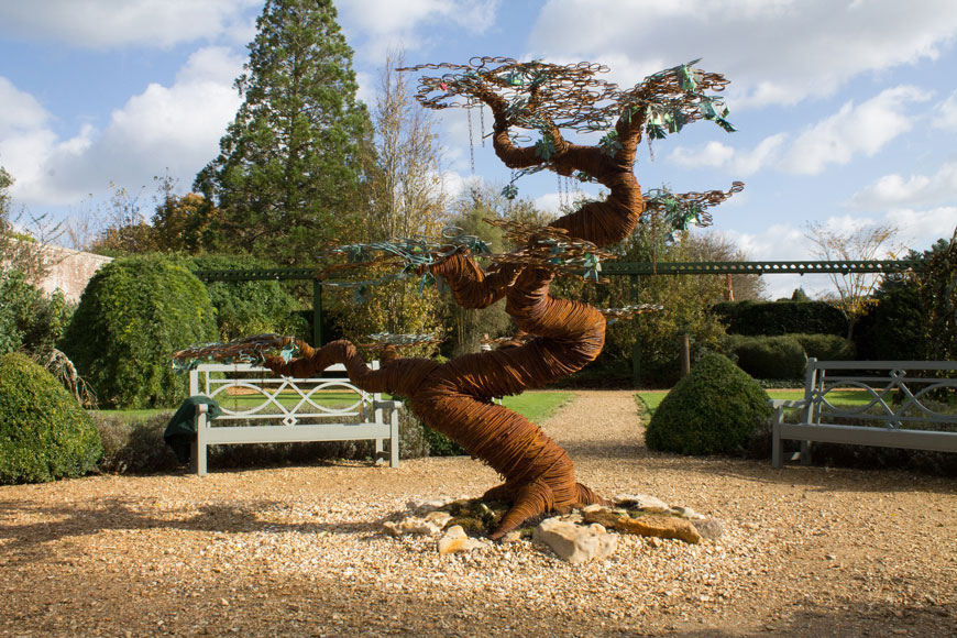 The steel and copper bonsai tree sculpture in the Victorian flower garden was commissioned by Jonathan Montagu and Nathalie Montagu Daoust as a symbol of their love for each other. All of the guests at their wedding in 2014 were given a padlock engraved with their name and a copper leaf to attach to the tree, interlocked with that of their partners as a reminder of the bond made in the marriage ceremony. Guests then ceremonially threw the keys to their locks into the Beaulieu River.