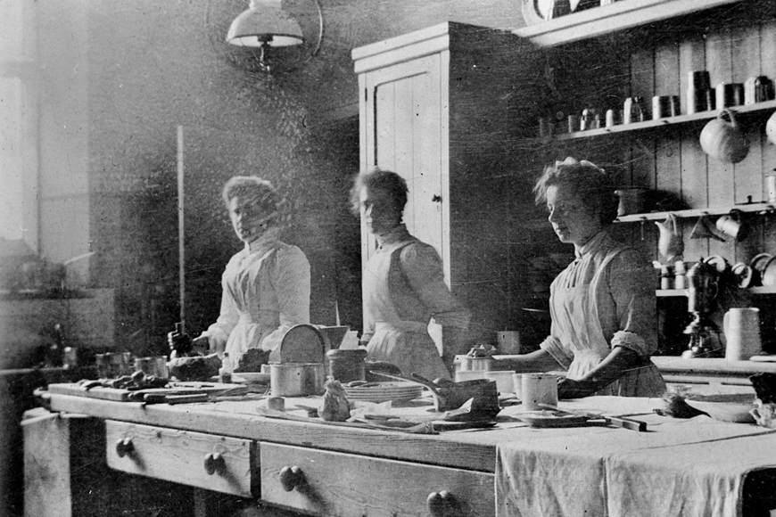 Before work could start, an extensive search of the archives and appeal for information was carried out in order to make the restoration as accurate as possible. Only one photograph of the original kitchen existed and showed Annie Louise Freeman at work with two unidentified kitchen maids c.1905. They are seen working at the same table which occupies the centre space of the kitchen today.