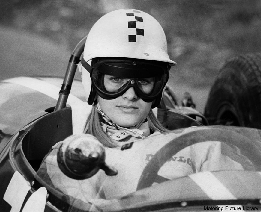 The first of these was Christabel Carlisle, a pretty, clever piano teacher from Surrey, who claims she only started racing because she found spectating so dull. Between 1960 and 1963, she competed all around the UK and in Europe, usually in a Don Moore-prepared Mini Cooper. Her best finish was probably a second place in the BSRC race at Brands Hatch in 1961, although she was a frequent visitor to the top three. She retired in 1963 after a terrible accident, in which a marshal was killed.
