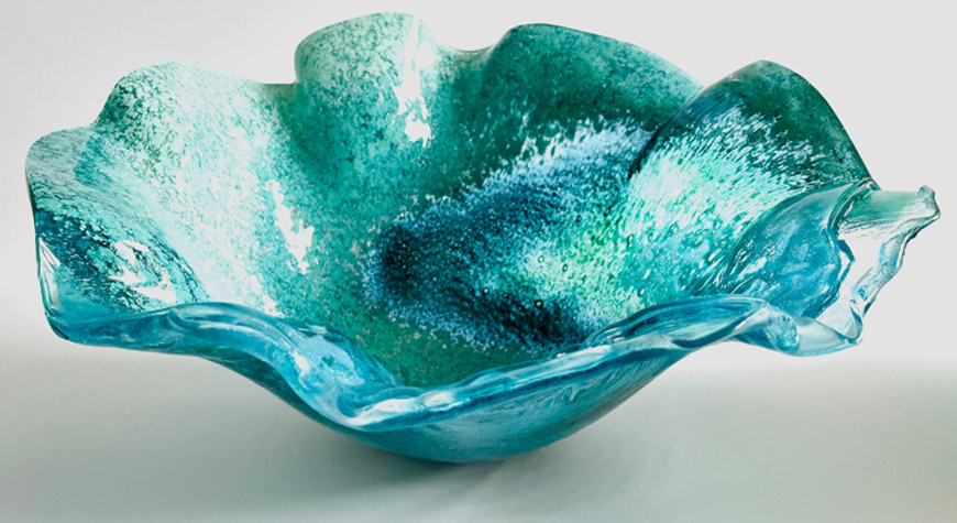 Each piece of Steve’s kiln-formed glass is crafted using specialised techniques he has developed and refined over many years. Rather than working with pre-coloured glass, he applies fine enamel powders to achieve distinctive textures, blended shades, and intricate patterns that define his unique style. His signature sculptural bowls are formed in handmade moulds that are partially destroyed during the firing process and must be rebuilt for each new piece—ensuring that every bowl is one of a kind.