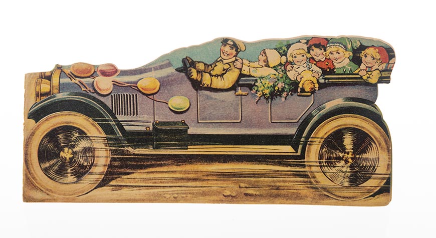 The techniques that were developed in the 20th century to mass produce, sell and service motor vehicles have transformed the way the world does business. Archive film of the 1913 Ford production line shows a transformation in industry, marking the start of motoring factory work as we know it. A 1920s children’s book telling the story of charabanc rides carrying workers and their families on day trips makes a colourful addition to the exhibition.